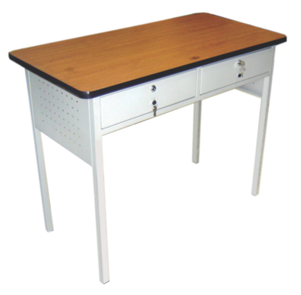 Estructura en tubo cuadrado de 1″ 1/4 calibre 18, con laminas laterales tipo faldero calibre 22. Dos (2) cajones metálicos calibre 22, con rieles metálicos para mayor seguridad. Chapa metálica para cada cajón , con un (1) par de llaves originales, asegurada con reaches pop. Manija metálica para cada cajón, asegurada con remaches pop. Tapa en triplex de 19mm. enchapada en fórmica de colores, bocelada con perfil plástico (negro o gris), o bordes lacados al natural. Soldadura MIG. Pintura en polvo electrostática (negro o gris). Tapones plásticos de alto impacto
