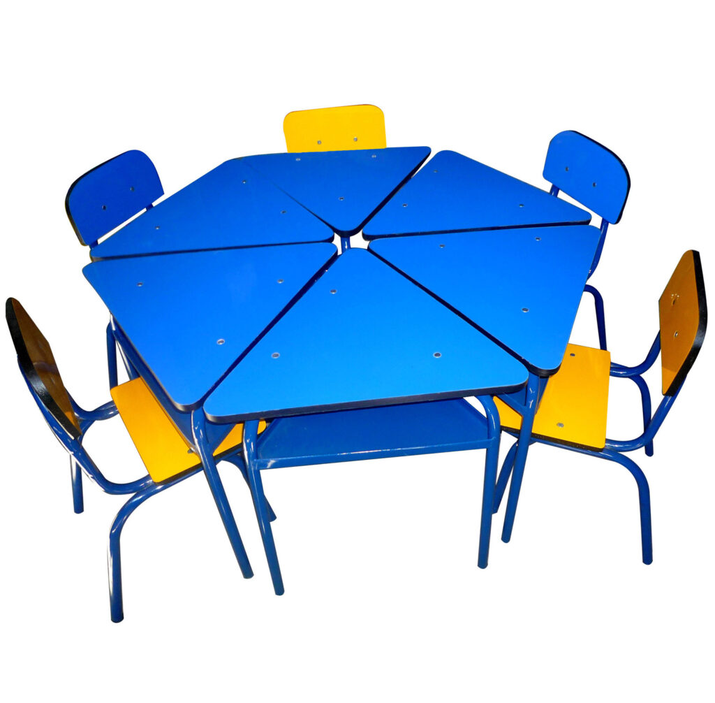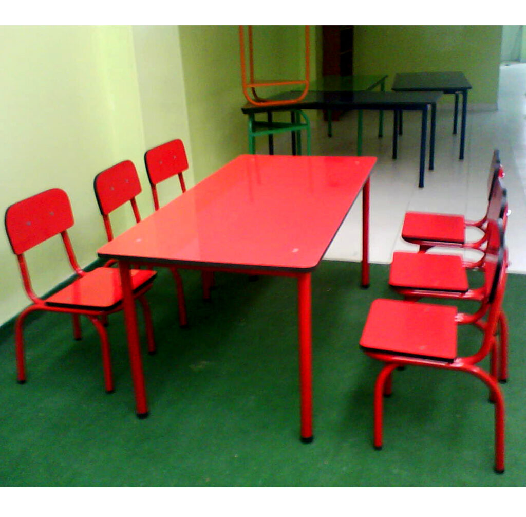 Estructura de mesas y sillas en tubo redondo 7/8 calibre 18, entrepaño en lámina cal 22, pintura electrostática, soldadura MIG, tapones plásticos de alto impacto. Madera triplex calibre 18 enchapado en fórmica de colores, asegurado con tornillos y tuercas de seguridad.