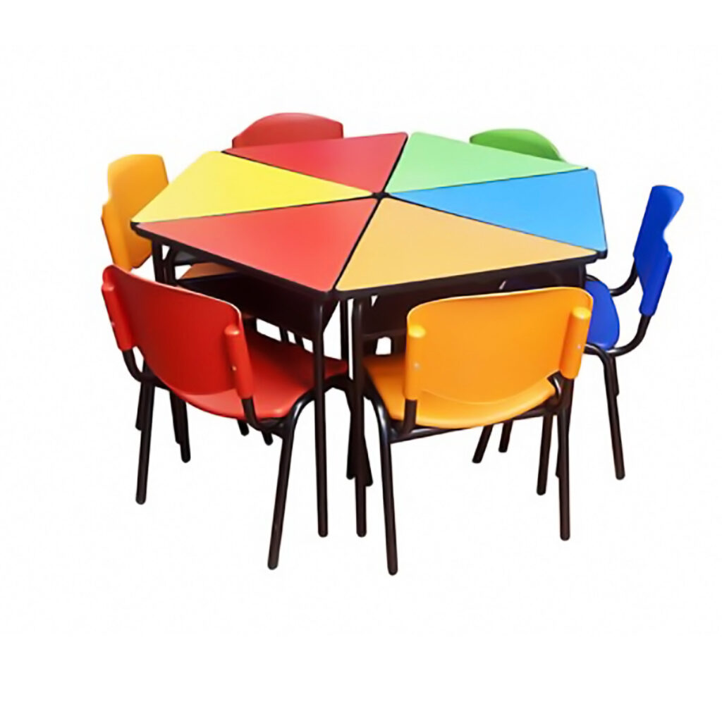 Estructura en ángulo, soldadura MIG, pintura electrostática, madera triplex de 12 mm enchapado en fórmica de colores, asegurado con tornillo y tuerca de seguridad.